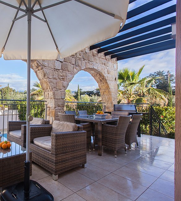Balconies and a shady terrace with stone arches and comfortable wicker furniture;