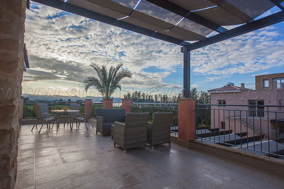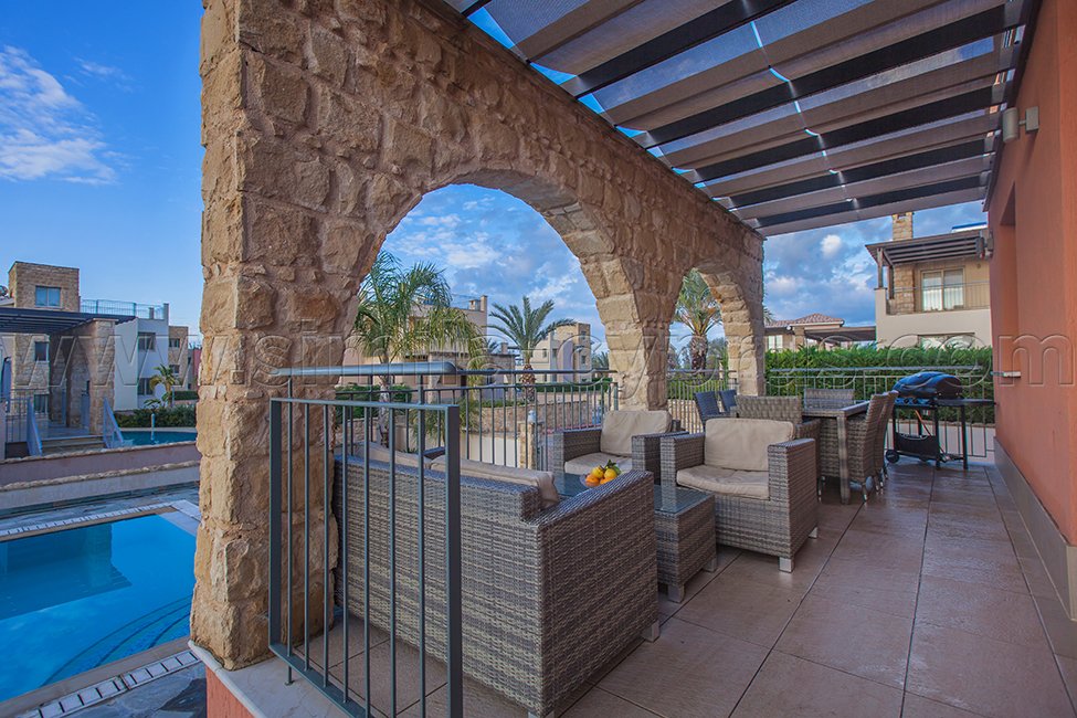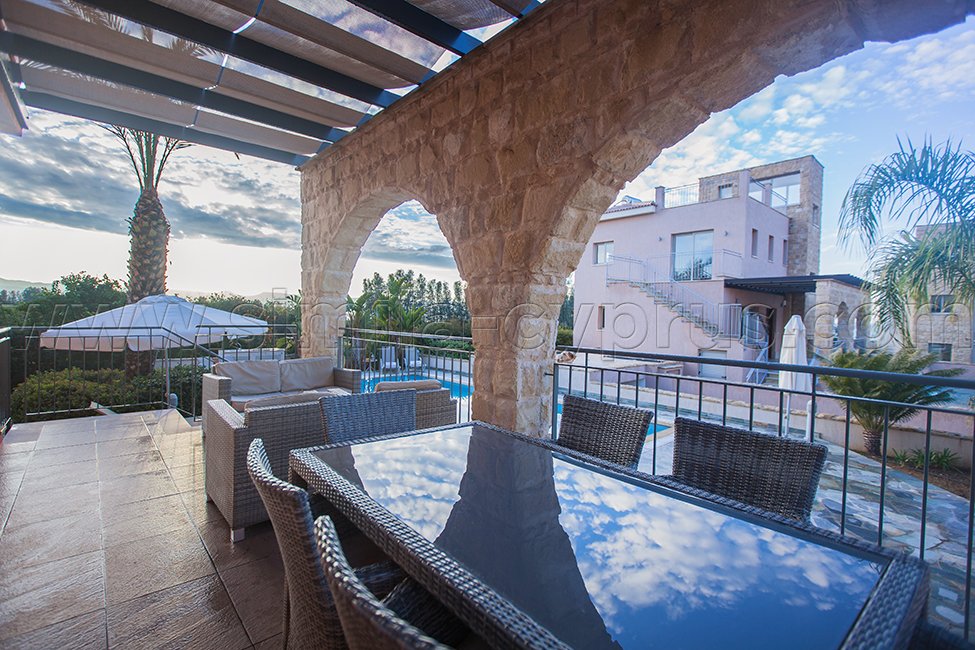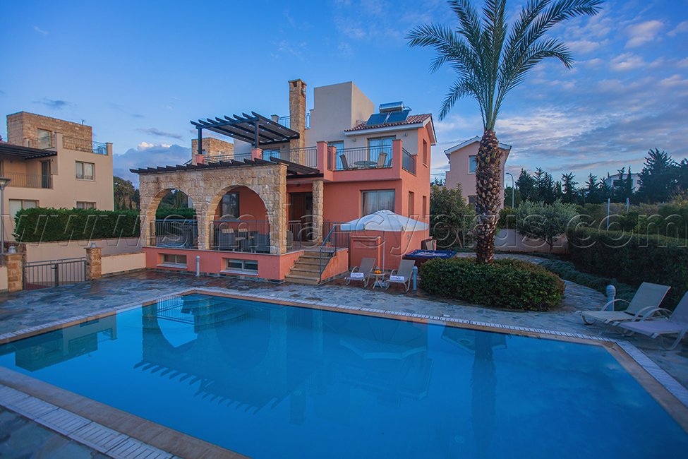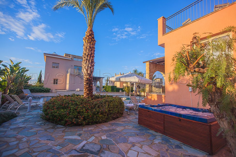 This is an Exclusive Gated Community with 24-hour security, which is located in a secluded area between the large citrus grove and forest. The beautiful sea, a cloudless sky, mountains and gardens covered with unusual shrubs, a flowering abundance of exotic plants and trees, as well as magnificent Deluxe Villas. All residents have exclusive access to a small private sandy beach, which is equipped with parasols and sun loungers. In August Turtles arrive on this beach and lay their eggs. If you're lucky, you can observe this wonderful miracle of nature - as the baby Turtles hatch from under the sand and make their way into the sea. The Government protects the beach as this is one of the few beaches in Cyprus where this happens. All these Elite Villas are constructed of high-quality modern materials, with natural stone, wood and marble. Each villa is situated on a spacious plot with a manicured garden with landscape design. Each villa is fully equipped and furnished, with private pools, "Jacuzzi" heated, some villas are also equipped with a sauna.